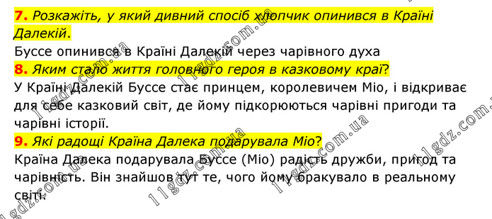 7. Розкажіть, у який дивний спосіб хлопчик опинився в Країні Далекій. Буссе опинився в Країні Далекій через чарівного духа 8. Яким стало життя головного героя в казковому краї? У Країні Далекій Буссе стає принцем, королевичем Міо, і відкриває для себе казковий світ, де йому підкорюються чарівні пригоди та чарівні історії. 9. Які радощі Країна Далека подарувала Міо? Країна Далека подарувала Буссе (Міо) радість дружби, пригод та чарівність. Він знайшов тут те, чого йому бракувало в реальному світі.