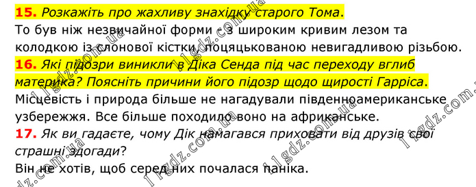 15. Розкажіть про жахливу знахідку старого Тома. То був ніж незвичайної форми - з широким кривим лезом та колодкою із слонової кістки, поцяцькованою невигадливою різьбою. 16. Які підозри виникли в Діка Сенда під час переходу вглиб материка? Поясніть причини його підозр щодо щирості Гарріса. Місцевість і природа більше не нагадували південноамериканське узбережжя. Все більше походило воно на африканське. 17. Як ви гадаєте, чому Дік намагався приховати від друзів свої страшні здогади? Він не хотів, щоб серед них почалася паніка.
