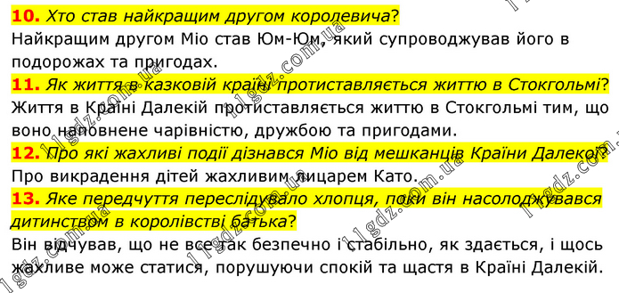 10. Хто став найкращим другом королевича? Найкращим другом Міо став Юм-Юм, який супроводжував його в подорожах та пригодах. 11. Як життя в казковій країні протиставляється життю в Стокгольмі? Життя в Країні Далекій протиставляється життю в Стокгольмі тим, що воно наповнене чарівністю, дружбою та пригодами. 12. Про які жахливі події дізнався Міо від мешканців Країни Далекої? Про викрадення дітей жахливим лицарем Като. 13. Яке передчуття переслідувало хлопця, поки він насолоджувався дитинством в королівстві батька? Він відчував, що не все так безпечно і стабільно, як здається, і щось жахливе може статися, порушуючи спокій та щастя в Країні Далекій.