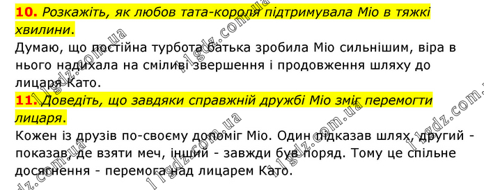 10. Розкажіть, як любов тата-короля підтримувала Міо в тяжкі хвилини. Думаю, що постійна турбота батька зробила Міо сильнішим, віра в нього надихала на сміливі звершення і продовження шляху до лицаря Като. 11. Доведіть, що завдяки справжній дружбі Міо зміг перемогти лицаря. Кожен із друзів по-своєму допоміг Міо. Один підказав шлях, другий - показав, де взяти меч, інший - завжди був поряд. Тому це спільне досягнення - перемога над лицарем Като.