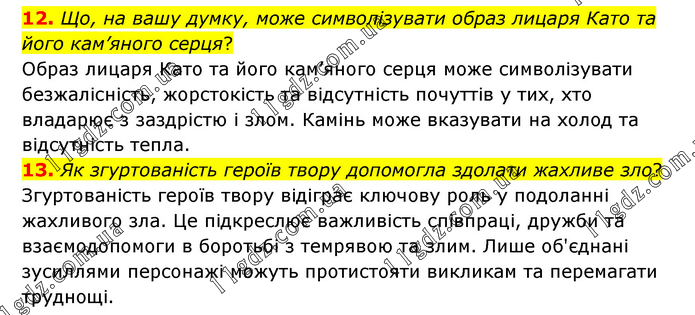 12. Що, на вашу думку, може символізувати образ лицаря Като та його кам’яного серця? Образ лицаря Като та його кам’яного серця може символізувати безжалісність, жорстокість та відсутність почуттів у тих, хто владарює з заздрістю і злом. Камінь може вказувати на холод та відсутність тепла. 13. Як згуртованість героїв твору допомогла здолати жахливе зло? Згуртованість героїв твору відіграє ключову роль у подоланні жахливого зла. Це підкреслює важливість співпраці, дружби та взаємодопомоги в боротьбі з темрявою та злим. Лише об'єднані зусиллями персонажі можуть протистояти викликам та перемагати труднощі.