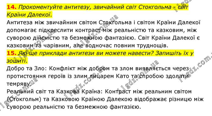 14. Прокоментуйте антитезу, звичайний світ Стокгольма - світ Країни Далекої. Антитеза між звичайним світом Стокгольма і світом Країни Далекої допомагає підкреслити контраст між реальністю та казковим, між суворою дійсністю та безмежною фантазією. Світ Країни Далекої є казковим та чарівним, але водночас повним труднощів. 15. Які ще приклади антитези ви можете навести? Запишіть їх у зошиті. Добро та Зло: Конфлікт між добром та злом виявляється через протистояння героїв із злим лицарем Като та спробою здолати темряву. Реальний світ та Казкова Країна: Контраст між реальним світом (Стокгольм) та Казковою Країною Далекою відображає різницю між суворою реальністю та безмежною фантазією.