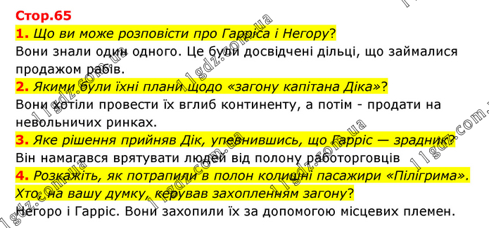1. Що ви може розповісти про Гарріса і Негору? Вони знали один одного. Це були досвідчені дільці, що займалися продажом рабів. 2. Якими були їхні плани щодо «загону капітана Діка»? Вони хотіли провести їх вглиб континенту, а потім - продати на невольничих ринках. 3. Яке рішення прийняв Дік, упевнившись, що Гарріс — зрадник? Він намагався врятувати людей від полону работорговців 4. Розкажіть, як потрапили в полон колишні пасажири «Пілігрима». Хто, на вашу думку, керував захопленням загону? Негоро і Гарріс. Вони захопили їх за допомогою місцевих племен.