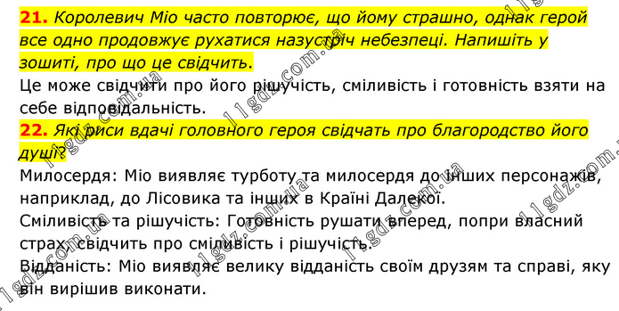 21. Королевич Міо часто повторює, що йому страшно, однак герой все одно продовжує рухатися назустріч небезпеці. Напишіть у зошиті, про що це свідчить. Це може свідчити про його рішучість, сміливість і готовність взяти на себе відповідальність. 22. Які риси вдачі головного героя свідчать про благородство його душі? Милосердя: Міо виявляє турботу та милосердя до інших персонажів, наприклад, до Лісовика та інших в Країні Далекої. Сміливість та рішучість: Готовність рушати вперед, попри власний страх, свідчить про сміливість і рішучість. Відданість: Міо виявляє велику відданість своїм друзям та справі, яку він вирішив виконати.