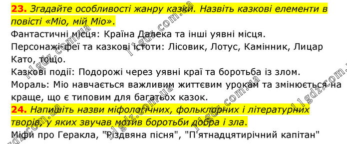 23. Згадайте особливості жанру казки. Назвіть казкові елементи в повісті «Міо, мій Міо». Фантастичні місця: Країна Далека та інші уявні місця. Персонажі-феї та казкові істоти: Лісовик, Лотус, Камінник, Лицар Като, тощо. Казкові події: Подорожі через уявні краї та боротьба із злом. Мораль: Міо навчається важливим життєвим урокам та змінюється на краще, що є типовим для багатьох казок. 24. Напишіть назви міфологічних, фольклорних і літературних творів, у яких звучав мотив боротьби добра і зла. Міфи про Геракла, "Різдвяна пісня", "П'ятнадцятирічний капітан"