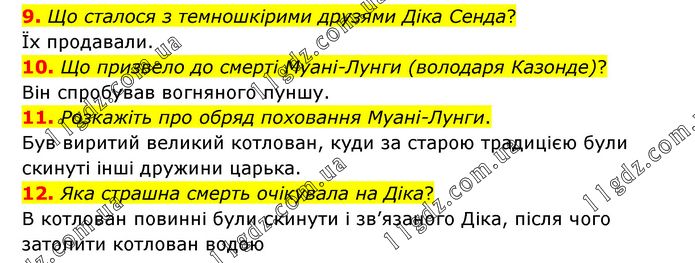 9. Що сталося з темношкірими друзями Діка Сенда? Їх продавали. 10. Що призвело до смерті Муані-Лунги (володаря Казонде)? Він спробував вогняного пуншу. 11. Розкажіть про обряд поховання Муані-Лунги. Був виритий великий котлован, куди за старою традицією були скинуті інші дружини царька. 12. Яка страшна смерть очікувала на Діка? В котлован повинні були скинути і зв’язаного Діка, після чого затопити котлован водою