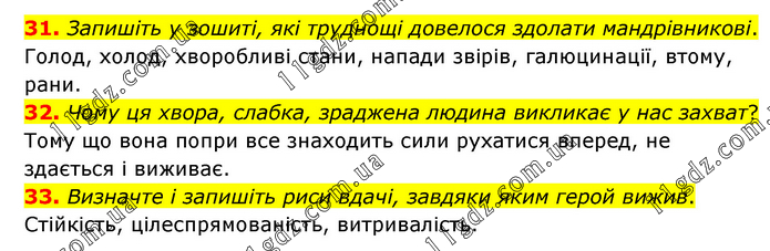 31. Запишіть у зошиті, які труднощі довелося здолати мандрівникові. Голод, холод, хворобливі стани, напади звірів, галюцинації, втому, рани. 32. Чому ця хвора, слабка, зраджена людина викликає у нас захват? Тому що вона попри все знаходить сили рухатися вперед, не здається і виживає. 33. Визначте і запишіть риси вдачі, завдяки яким герой вижив. Стійкість, цілеспрямованість, витривалість.