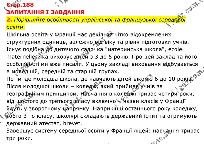 ЗАПИТАННЯ І ЗАВДАННЯ 2. Порівняйте особливості української та французької середньої освіти. Шкільна освіта у Франції має декілька чітко відокремлених структурних одиниць, залежно від віку та рівня підготовки учнів. Існує подібна до дитячого садочка "материнська школа", école maternelle, яка виховує дітей з 3 до 5 років. Про цей заклад та його особливості ми вже писали. У цьому закладі виховання відбувається в молодшій, середній та старшій групах. Потім іде молодша школа, де навчають дітей віком з 6 до 10 років. Після молодшої школи – коледж, який приймає учнів за географічним принципом. Навчання в коледжі триває чотири роки, від шостого до третього класу включно – назви класів у Франції йдуть у зворотному напрямку. Наприкінці останнього року коледжу, тобто 3-го класу, школярі складають державний іспит та отримують державний атестат, brevet. Завершує систему середньої освіти у Франції ліцей: навчання триває три роки.