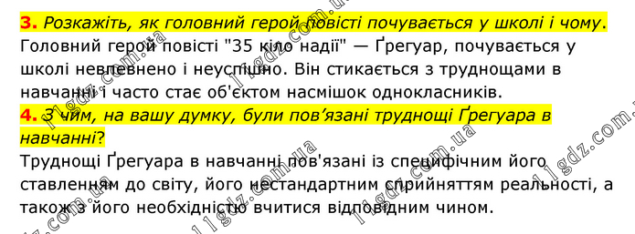 3. Розкажіть, як головний герой повісті почувається у школі і чому. Головний герой повісті "35 кіло надії" — Ґрегуар, почувається у школі невпевнено і неуспішно. Він стикається з труднощами в навчанні і часто стає об'єктом насмішок однокласників. 4. З чим, на вашу думку, були пов’язані труднощі Ґрегуара в навчанні? Труднощі Ґрегуара в навчанні пов'язані із специфічним його ставленням до світу, його нестандартним сприйняттям реальності, а також з його необхідністю вчитися відповідним чином.