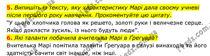 5. Випишіть із тексту, яку характеристику Марі дала своєму учневі після першого року навчання. Прокоментуйте цю цитату. “У цього хлопчика голова як решето, золоті руки і величезне серце. Якщо докласти зусиль, із нього будуть люди”. 6. Які таланти побачила вчителька Марі в Ґрегуара? Вчителька Марі помітила таланти Ґрегуара в галузі винаходів та його здатність бачити світ інакше, ніж інші.