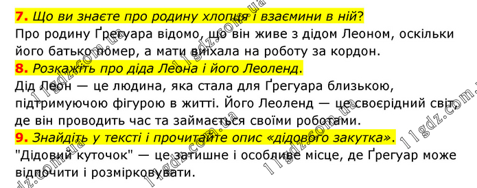 7. Що ви знаєте про родину хлопця і взаємини в ній? Про родину Ґрегуара відомо, що він живе з дідом Леоном, оскільки його батько помер, а мати виїхала на роботу за кордон. 8. Розкажіть про діда Леона і його Леоленд. Дід Леон — це людина, яка стала для Ґрегуара близькою, підтримуючою фігурою в житті. Його Леоленд — це своєрідний світ, де він проводить час та займається своїми роботами. 9. Знайдіть у тексті і прочитайте опис «дідового закутка». "Дідовий куточок" — це затишне і особливе місце, де Ґрегуар може відпочити і розмірковувати.