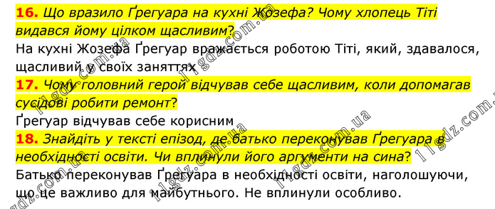 16. Що вразило Ґрегуара на кухні Жозефа? Чому хлопець Тіті видався йому цілком щасливим? На кухні Жозефа Ґрегуар вражається роботою Тіті, який, здавалося, щасливий у своїх заняттях 17. Чому головний герой відчував себе щасливим, коли допомагав сусідові робити ремонт? Ґрегуар відчував себе корисним 18. Знайдіть у тексті епізод, де батько переконував Ґрегуара в необхідності освіти. Чи вплинули його аргументи на сина? Батько переконував Ґрегуара в необхідності освіти, наголошуючи, що це важливо для майбутнього. Не вплинули особливо.