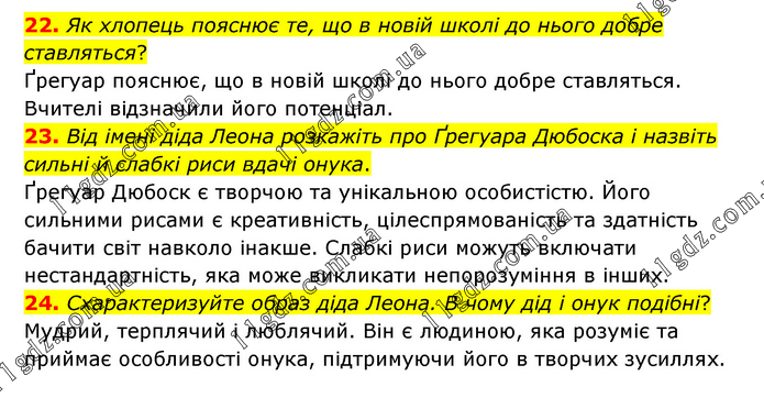 22. Як хлопець пояснює те, що в новій школі до нього добре ставляться? Ґрегуар пояснює, що в новій школі до нього добре ставляться. Вчителі відзначили його потенціал. 23. Від імені діда Леона розкажіть про Ґрегуара Дюбоска і назвіть сильні й слабкі риси вдачі онука. Ґрегуар Дюбоск є творчою та унікальною особистістю. Його сильними рисами є креативність, цілеспрямованість та здатність бачити світ навколо інакше. Слабкі риси можуть включати нестандартність, яка може викликати непорозуміння в інших. 24. Схарактеризуйте образ діда Леона. В чому дід і онук подібні? Мудрий, терплячий і люблячий. Він є людиною, яка розуміє та приймає особливості онука, підтримуючи його в творчих зусиллях.