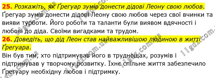 25. Розкажіть, як Ґрегуар зумів донести дідові Леону свою любов. Ґрегуар зумів донести дідові Леону свою любов через свої вчинки та вияви турботи. Його роботи та таланти були виявом вдячності і любові до діда. Своїми вигадками та трудом. 26. Доведіть, що дід Леон став найважливішою людиною в житті Ґрегуара. Він був тим, хто підтримував його в труднощах, розумів і підтримував у творчому розвитку. Їхнє спільне життя забезпечило Ґрегуару необхідну любов і підтримку.