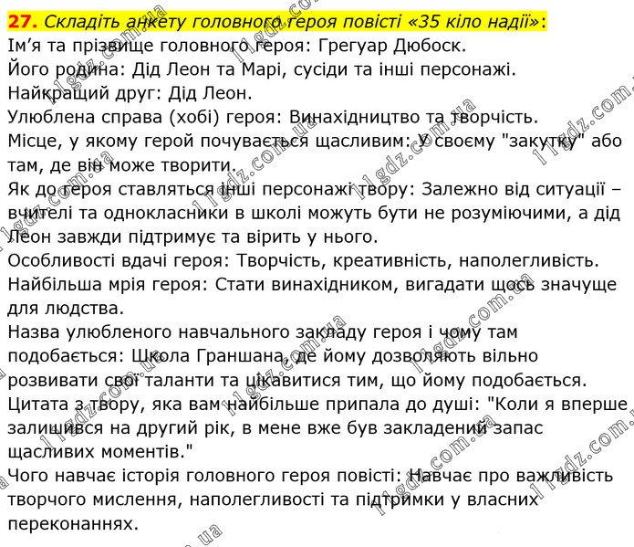 27. Складіть анкету головного героя повісті «35 кіло надії»: Ім’я та прізвище головного героя: Грегуар Дюбоск. Його родина: Дід Леон та Марі, сусіди та інші персонажі. Найкращий друг: Дід Леон. Улюблена справа (хобі) героя: Винахідництво та творчість. Місце, у якому герой почувається щасливим: У своєму "закутку" або там, де він може творити. Як до героя ставляться інші персонажі твору: Залежно від ситуації – вчителі та однокласники в школі можуть бути не розуміючими, а дід Леон завжди підтримує та вірить у нього. Особливості вдачі героя: Творчість, креативність, наполегливість. Найбільша мрія героя: Стати винахідником, вигадати щось значуще для людства. Назва улюбленого навчального закладу героя і чому там подобається: Школа Граншана, де йому дозволяють вільно розвивати свої таланти та цікавитися тим, що йому подобається. Цитата з твору, яка вам найбільше припала до душі: "Коли я вперше залишився на другий рік, в мене вже був закладений запас щасливих моментів." Чого навчає історія головного героя повісті: Навчає про важливість творчого мислення, наполегливості та підтримки у власних переконаннях.