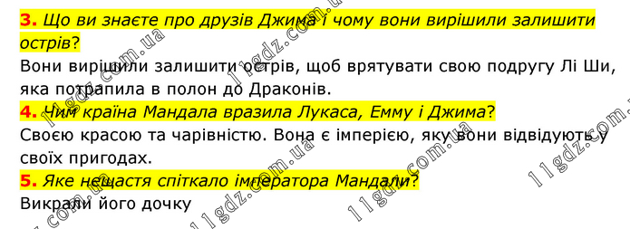 3. Що ви знаєте про друзів Джима і чому вони вирішили залишити острів? Вони вирішили залишити острів, щоб врятувати свою подругу Лі Ши, яка потрапила в полон до Драконів. 4. Чим країна Мандала вразила Лукаса, Емму і Джима? Своєю красою та чарівністю. Вона є імперією, яку вони відвідують у своїх пригодах. 5. Яке нещастя спіткало імператора Мандали? Викрали його дочку