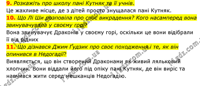 9. Розкажіть про школу пані Кутняк та її учнів. Це жахливе місце, де з дітей просто знущалася пані Кутняк. 10. Що Лі Ши розповіла про своє викрадення? Кого насамперед вона звинувачувала у своєму горі? Вона звинувачує Драконів у своєму горі, оскільки це вони відібрали її від рідних 11. Що дізнався Джим Ґудзик про своє походження і те, як він опинився в Недогадії? Виявляється, що він створений Драконами як живий ляльковий хлопчик. Вони віддали його під опіку пані Кутняк, де він виріс та навчився жити серед мешканців Недогадію.