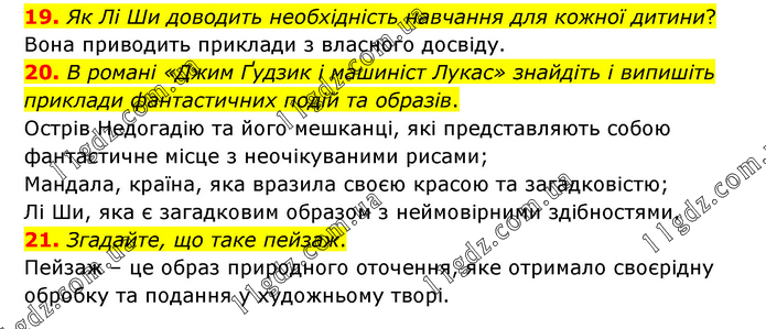 19. Як Лі Ши доводить необхідність навчання для кожної дитини? Вона приводить приклади з власного досвіду. 20. В романі «Джим Ґудзик і машиніст Лукас» знайдіть і випишіть приклади фантастичних подій та образів. Острів Недогадію та його мешканці, які представляють собою фантастичне місце з неочікуваними рисами; Мандала, країна, яка вразила своєю красою та загадковістю; Лі Ши, яка є загадковим образом з неймовірними здібностями. 21. Згадайте, що таке пейзаж. Пейзаж – це образ природного оточення, яке отримало своєрідну обробку та подання у художньому творі.