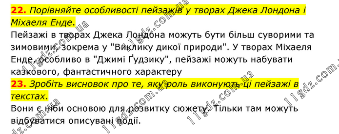 22. Порівняйте особливості пейзажів у творах Джека Лондона і Міхаеля Енде. Пейзажі в творах Джека Лондона можуть бути більш суворими та зимовими, зокрема у "Виклику дикої природи". У творах Міхаеля Енде, особливо в "Джимі Ґудзику", пейзажі можуть набувати казкового, фантастичного характеру 23. Зробіть висновок про те, яку роль виконують ці пейзажі в текстах. Вони є ніби основою для розвитку сюжету. Тільки там можуть відбуватися описувані події.