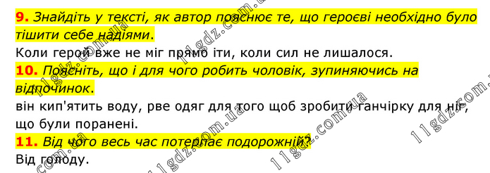 9. Знайдіть у тексті, як автор пояснює те, що героєві необхідно було тішити себе надіями. Коли герой вже не міг прямо іти, коли сил не лишалося. 10. Поясніть, що і для чого робить чоловік, зупиняючись на відпочинок. він кип'ятить воду, рве одяг для того щоб зробити ганчірку для ніг, що були поранені. 11. Від чого весь час потерпає подорожній? Від голоду.