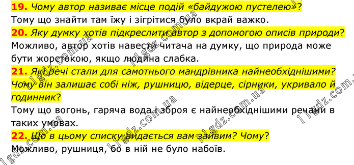 19. Чому автор називає місце подій «байдужою пустелею»? Тому що знайти там їжу і зігрітися було вкрай важко. 20. Яку думку хотів підкреслити автор з допомогою описів природи? Можливо, автор хотів навести читача на думку, що природа може бути жорстокою, якщо людина слабка. 21. Які речі стали для самотнього мандрівника найнеобхіднішими? Чому він залишає собі ніж, рушницю, відерце, сірники, укривало й годинник? Тому що вогонь, гаряча вода і зброя є найнеобхіднішими речами в таких умовах. 22. Що в цьому списку видається вам зайвим? Чому? Можливо, рушниця, бо в ній не було набоїв.