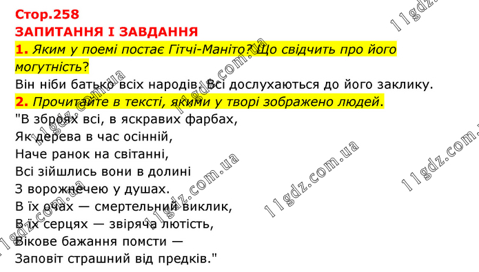 ЗАПИТАННЯ І ЗАВДАННЯ 1. Яким у поемі постає Гітчі-Маніто? Що свідчить про його могутність? Він ніби батько всіх народів. Всі дослухаються до його заклику. 2. Прочитайте в тексті, якими у творі зображено людей. "В зброях всі, в яскравих фарбах, Як дерева в час осінній, Наче ранок на світанні, Всі зійшлись вони в долині З ворожнечею у душах. В їх очах — смертельний виклик, В їх серцях — звіряча лютість, Вікове бажання помсти — Заповіт страшний від предків."