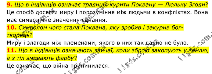 9. Що в індіанців означає традиція курити Поквану — Люльку Згоди? Це спосіб досягти миру і порозуміння між людьми в конфліктах. Вона має символічне значення єднання. 10. Символом чого стала Поквана, яку зробив і закурив бог-творець? Миру і злагоди між племенами, якого в них так давно не було. 11. Що в індіанців означають звичаї, коли зброю закопують у землю, а з тіл змивають фарбу? Це означає, що війна припинилася.
