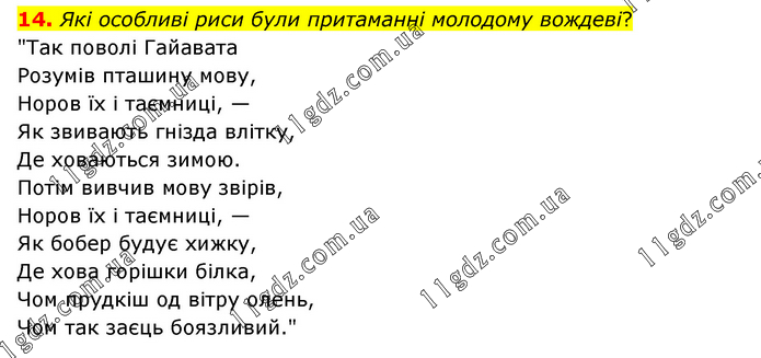Які особливі риси були притаманні молодому вождеві? "Так поволі Гайавата Розумів пташину мову, Норов їх і таємниці, — Як звивають гнізда влітку, Де ховаються зимою. Потім вивчив мову звірів, Норов їх і таємниці, — Як бобер будує хижку, Де хова горішки білка, Чом прудкіш од вітру олень, Чом так заєць боязливий."