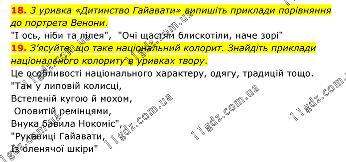 18. 3 уривка «Дитинство Гайавати» випишіть приклади порівняння до портрета Венони. "І ось, ніби та лілея", "Очі щастям блискотіли, наче зорі" 19. З’ясуйте, що таке національний колорит. Знайдіть приклади національного колориту в уривках твору. Це особливості національного характеру, одягу, традицій тощо. "Там у липовій колисці, Встеленій кугою й мохом, Оповитій ремінцями, Внука бавила Нокоміс", "Рукавиці Гайавати, Із оленячої шкіри"