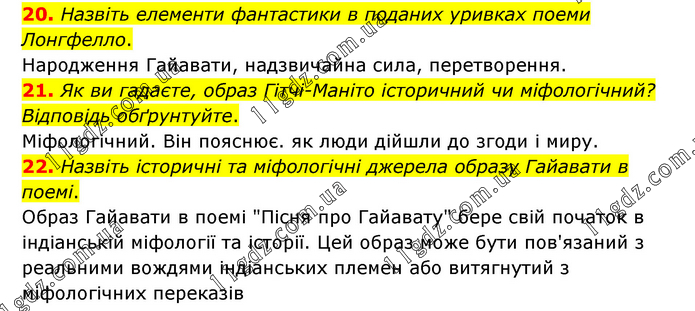 20. Назвіть елементи фантастики в поданих уривках поеми Лонгфелло. Народження Гайавати, надзвичайна сила, перетворення. 21. Як ви гадаєте, образ Гітчі-Маніто історичний чи міфологічний? Відповідь обґрунтуйте. Міфологічний. Він пояснює. як люди дійшли до згоди і миру. 22. Назвіть історичні та міфологічні джерела образу Гайавати в поемі. Образ Гайавати в поемі "Пісня про Гайавату" бере свій початок в індіанській міфології та історії. Цей образ може бути пов'язаний з реальними вождями індіанських племен або витягнутий з міфологічних переказів