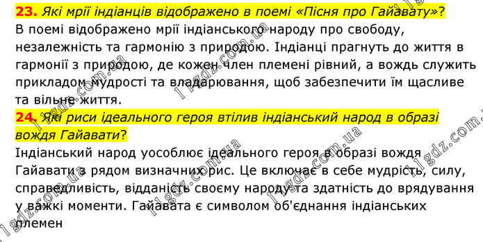 23. Які мрії індіанців відображено в поемі «Пісня про Гайавату»? В поемі відображено мрії індіанського народу про свободу, незалежність та гармонію з природою. Індіанці прагнуть до життя в гармонії з природою, де кожен член племені рівний, а вождь служить прикладом мудрості та владарювання, щоб забезпечити їм щасливе та вільне життя. 24. Які риси ідеального героя втілив індіанський народ в образі вождя Гайавати? Індіанський народ уособлює ідеального героя в образі вождя Гайавати з рядом визначних рис. Це включає в себе мудрість, силу, справедливість, відданість своєму народу та здатність до врядування у важкі моменти. Гайавата є символом об'єднання індіанських племен