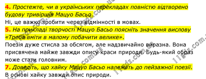 4. Простежте, чи в українських перекладах повністю відтворено будову тривіршів Мацуо Басьо. Ні, це важко зробити через відмінності в мовах. 5. На прикладі творчості Мацуо Басьо поясніть значення вислову «Треба вміти в малому побачити велике». Поезія дуже стисла за обсягом, але надзвичайно виразна. Вона присвячена майже завжди опису краси природи. Будь-який образ може стати головним. 7. Доведіть, що хайку Мацуо Басьо належать до пейзажної поезії. В основі хайку завжди опис природи.