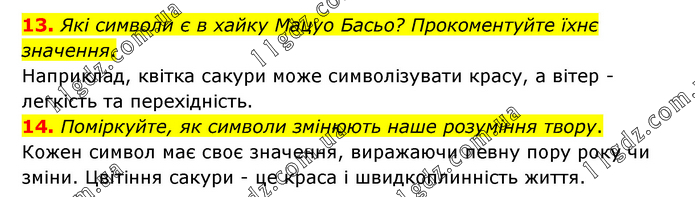 13. Які символи є в хайку Мацуо Басьо? Прокоментуйте їхнє значення. Наприклад, квітка сакури може символізувати красу, а вітер - легкість та перехідність. 14. Поміркуйте, як символи змінюють наше розуміння твору. Кожен символ має своє значення, виражаючи певну пору року чи зміни. Цвітіння сакури - це краса і швидкоплинність життя.