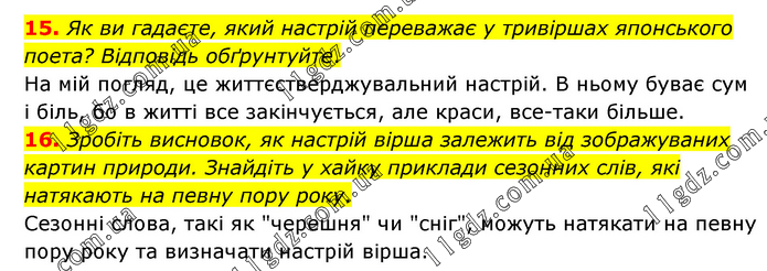 15. Як ви гадаєте, який настрій переважає у тривіршах японського поета? Відповідь обґрунтуйте. На мій погляд, це життєстверджувальний настрій. В ньому буває сум і біль, бо в житті все закінчується, але краси, все-таки більше. 16. Зробіть висновок, як настрій вірша залежить від зображуваних картин природи. Знайдіть у хайку приклади сезонних слів, які натякають на певну пору року. Сезонні слова, такі як "черешня" чи "сніг", можуть натякати на певну пору року та визначати настрій вірша.