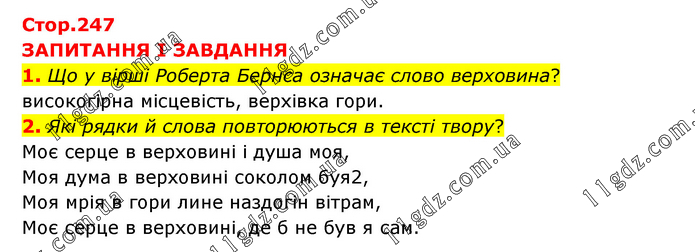 ЗАПИТАННЯ І ЗАВДАННЯ 1. Що у вірші Роберта Бернса означає слово верховина? високогірна місцевість, верхівка гори. 2. Які рядки й слова повторюються в тексті твору? Моє серце в верховині і душа моя, Моя дума в верховині соколом буя2, Моя мрія в гори лине наздогін вітрам, Моє серце в верховині, де б не був я сам.
