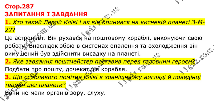 ЗАПИТАННЯ І ЗАВДАННЯ 1. Хто такий Лерой Кліві і як він опинився на кисневій планеті З-М-22? Це астронавт. Він рухався на поштовому кораблі, виконуючи свою роботу. Внаслідок збою в системах опалення та охолодження він вимушений був здійснити висадку на планеті. 2. Яке завдання поштмейстер поставив перед головним героєм? Подбати про пошту, дочекатися корабля. 3. Що особливого помітив Кліві в зовнішньому вигляді й поведінці тварин цієї планети? Вони не мали органів зору, слуху.