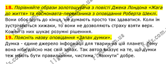 18. Порівняйте образи золотошукача з повісті Джека Лондона «Жага до життя» та космонавта-перевізника з оповідання Роберта Шеклі. Вони обоє ідуть до кінця, не думають просто так здаватися. Коли їм зустрічаються хижаки, то вони не дозволяють страху взяти верх. Кожен із них шукає розумні рішенння. 19. Поясніть назву оповідання «Запах думки». Думка - єдине джерело інформації для тварин на цій планеті. Тому вона ніби дійсно має свій запах. Так автор вказує на те, що думки теж мають бути правильними, чистими, "пахнути" добре.