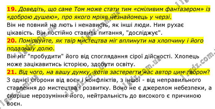 19. Доведіть, що саме Том може стати тим «сміливим фантазером» із «доброю душею», про якого мріяв незнайомець у черзі. Він не повний на лють і ненависть, як інші люди. Ним рухає цікавість. Він постійно ставить питання, "досліджує". 20. Поміркуйте, як твір мистецтва міг вплинути на хлопчину і його подальшу долю. Він міг "пробудити" його від споглядання сірої дійсності. Хлопець може зацікавитись історією, здобути освіту. 21. Від чого, на вашу думку, хотів застерегти нас автор цим твором? З однієї сторони від воєн і конфліктів, з іншої - від неправильного ставлення до мистецтва і розвитку. Воно не є джерелом небезпеки, а скоріше нерозуміння його, нейтральність до високого є причиною воєн.