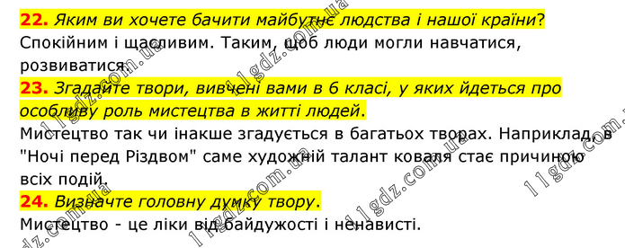 22. Яким ви хочете бачити майбутнє людства і нашої країни? Спокійним і щасливим. Таким, щоб люди могли навчатися, розвиватися. 23. Згадайте твори, вивчені вами в 6 класі, у яких йдеться про особливу роль мистецтва в житті людей. Мистецтво так чи інакше згадується в багатьох творах. Наприклад, в "Ночі перед Різдвом" саме художній талант коваля стає причиною всіх подій. 24. Визначте головну думку твору. Мистецтво - це ліки від байдужості і ненависті.