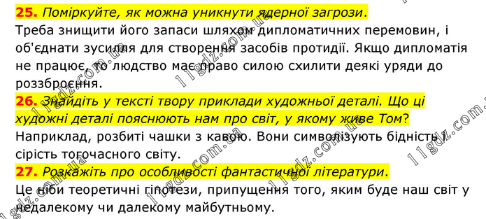 25. Поміркуйте, як можна уникнути ядерної загрози. Треба знищити його запаси шляхом дипломатичних перемовин, і об'єднати зусилля для створення засобів протидії. Якщо дипломатія не працює, то людство має право силою схилити деякі уряди до роззброєння. 26. Знайдіть у тексті твору приклади художньої деталі. Що ці художні деталі пояснюють нам про світ, у якому живе Том? Наприклад, розбиті чашки з кавою. Вони символізують бідність і сірість тогочасного світу. 27. Розкажіть про особливості фантастичної літератури. Це ніби теоретичні гіпотези, припущення того, яким буде наш світ у недалекому чи далекому майбутньому.