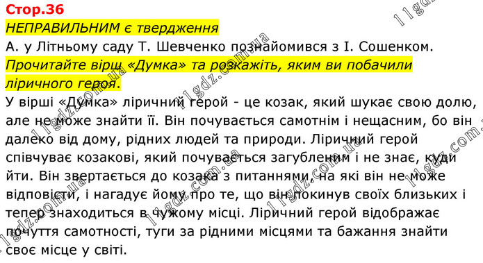 НЕПРАВИЛЬНИМ є твердження А. у Літньому саду Т. Шевченко познайомився з І. Сошенком. Прочитайте вірш «Думка» та розкажіть, яким ви побачили ліричного героя. У вірші «Думка» ліричний герой - це козак, який шукає свою долю, але не може знайти її. Він почувається самотнім і нещасним, бо він далеко від дому, рідних людей та природи. Ліричний герой співчуває козакові, який почувається загубленим і не знає, куди йти. Він звертається до козака з питаннями, на які він не може відповісти, і нагадує йому про те, що він покинув своїх близьких і тепер знаходиться в чужому місці. Ліричний герой відображає почуття самотності, туги за рідними місцями та бажання знайти своє місце у світі.