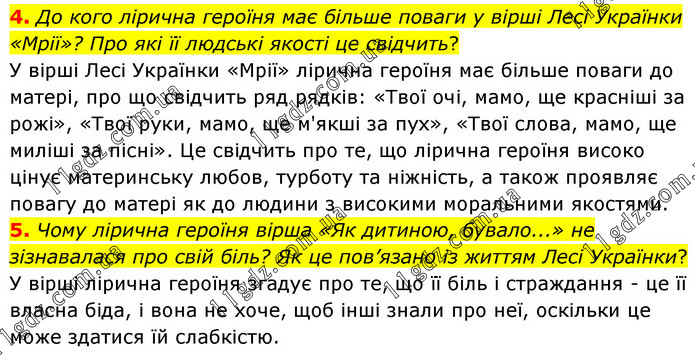 4. До кого лірична героїня має більше поваги у вірші Лесі Українки «Мрії»? Про які її людські якості це свідчить? У вірші Лесі Українки «Мрії» лірична героїня має більше поваги до матері, про що свідчить ряд рядків: «Твої очі, мамо, ще красніші за рожі», «Твої руки, мамо, ще м'якші за пух», «Твої слова, мамо, ще миліші за пісні». Це свідчить про те, що лірична героїня високо цінує материнську любов, турботу та ніжність, а також проявляє повагу до матері як до людини з високими моральними якостями. 5. Чому лірична героїня вірша «Як дитиною, бувало...» не зізнавалася про свій біль? Як це пов’язано із життям Лесі Українки? У вірші лірична героїня згадує про те, що її біль і страждання - це її власна біда, і вона не хоче, щоб інші знали про неї, оскільки це може здатися їй слабкістю.