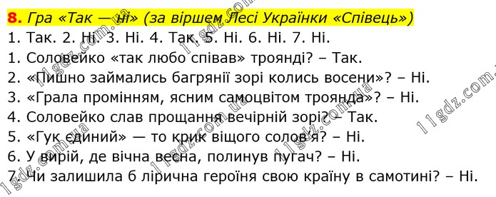 Гра «Так — ні» (за віршем Лесі Українки «Співець») 1. Так. 2. Ні. 3. Ні. 4. Так. 5. Ні. 6. Ні. 7. Ні. 1. Соловейко «так любо співав» троянді? – Так. 2. «Пишно займались багрянії зорі колись восени»? – Ні. 3. «Грала промінням, ясним самоцвітом троянда»? – Ні. 4. Соловейко слав прощання вечірній зорі? – Так. 5. «Гук єдиний» — то крик віщого солов’я? – Ні. 6. У вирій, де вічна весна, полинув пугач? – Ні. 7. Чи залишила б лірична героїня свою країну в самотині? – Ні.