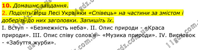 Домашнє завдання. 2. Поділіть вірш Лесі Українки «Співець» на частини за змістом і доберіть до них заголовки. Запишіть їх. I. Вступ - «Безмежність неба». II. Опис природи - «Краса природи». III. Опис співу солов'я - «Музика природи». IV. Висновок - «Забуття журби».