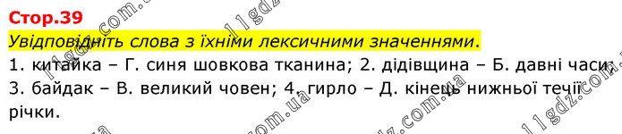 Увідповідніть слова з їхніми лексичними значеннями. 1. китайка – Г. синя шовкова тканина; 2. дідівщина – Б. давні часи; 3. байдак – В. великий човен; 4. гирло – Д. кінець нижньої течії річки.