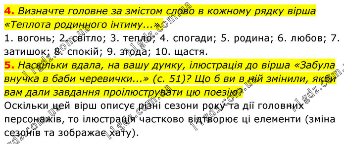 4. Визначте головне за змістом слово в кожному рядку вірша «Теплота родинного інтиму...». 1. вогонь; 2. світло; 3. тепло; 4. спогади; 5. родина; 6. любов; 7. затишок; 8. спокій; 9. згода; 10. щастя. 5. Наскільки вдала, на вашу думку, ілюстрація до вірша «Забула внучка в баби черевички...» (с. 51)? Що б ви в ній змінили, якби вам дали завдання проілюструвати цю поезію? Оскільки цей вірш описує різні сезони року та дії головних персонажів, то ілюстрація частково відтворює ці елементи (зміна сезонів та зображає хату).