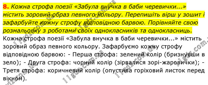 Кожна строфа поезії «Забула внучка в баби черевички...» містить зоровий образ певного кольору. Перепишіть вірш у зошит і зафарбуйте кожну строфу відповідною барвою. Порівняйте свою розмальовку з роботами своїх однокласників та однокласниць. Кожна строфа поезії «Забула внучка в баби черевички...» містить зоровий образ певного кольору. Зафарбуємо кожну строфу відповідною барвою: - Перша строфа: зелений колір (бризнувши в зело); - Друга строфа: чорний колір (зірвалися зорі-жаровички); - Третя строфа: коричневий колір (опустила горіховий листок перед вікном).