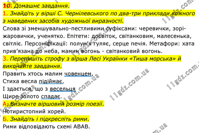Домашнє завдання. 1. Знайдіть у вірші С. Чернілевського по два-три приклади кожного з наведених засобів художньої виразності. Слова зі зменшувально-пестливими суфіксами: черевички, зорі-жаровички, ученятко. Епітети: досвіток, світанковим, малесенька, світліє. Персоніфікації: полум’я гуляє, серце печія. Метафори: хата прив’язана до неба, мамин вогонь - світанковий вогонь. 3. Перепишіть строфу з вірша Лесі Українки «Тиша морська» й виконайте завдання. Править хтось малим човенцем, Стиха весла підіймає, І здається, що з весельця Щире золото спадає. А. Визначте віршовий розмір поезії. Чотиристопний хорей. Б. Знайдіть і підкресліть рими. Рими відповідають схемі ABAB.