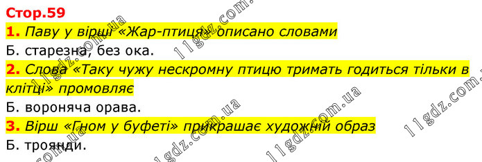 1. Паву у вірші «Жар-птиця» описано словами Б. старезна, без ока. 2. Слова «Таку чужу нескромну птицю тримать годиться тільки в клітці» промовляє Б. вороняча орава. 3. Вірш «Гном у буфеті» прикрашає художній образ Б. троянди.