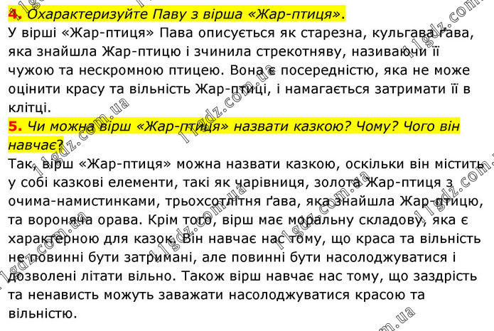 4. Охарактеризуйте Паву з вірша «Жар-птиця». У вірші «Жар-птиця» Пава описується як старезна, кульгава ґава, яка знайшла Жар-птицю і зчинила стрекотняву, називаючи її чужою та нескромною птицею. Вона є посередністю, яка не може оцінити красу та вільність Жар-птиці, і намагається затримати її в клітці. 5. Чи можна вірш «Жар-птиця» назвати казкою? Чому? Чого він навчає? Так, вірш «Жар-птиця» можна назвати казкою, оскільки він містить у собі казкові елементи, такі як чарівниця, золота Жар-птиця з очима-намистинками, трьохсотлітня ґава, яка знайшла Жар-птицю, та вороняча орава. Крім того, вірш має моральну складову, яка є характерною для казок. Він навчає нас тому, що краса та вільність не повинні бути затримані, але повинні бути насолоджуватися і дозволені літати вільно. Також вірш навчає нас тому, що заздрість та ненависть можуть заважати насолоджуватися красою та вільністю.
